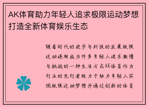 随着时代的进步与科技的发展,极限运动逐渐成为许多年轻人追求激情与挑战的一种生活方式。AK体育作为行业的先行者,致力于助力年轻人实现极限运动梦想,并通过创新的体育娱乐生态,为年轻一代提供更多展示自我、超越极限的机会。本文将从四个方面详细阐述AK体育如何打造全新体育娱乐生态,推动极限运动的发展,帮助年轻人实现自己的运动梦想,并为未来的体育产业带来全新的风貌。